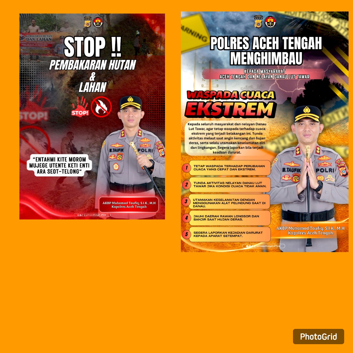 “Waspada dengan cuaca Ektrem, tetap waspada terhadap perubahan cuaca yang cepat dan ekstrem, tunda aktivitas nelayan Danau Lut Tawar jika kondisi cuaca tidak aman, utamakan keselamatan dengan menggunakan alat pelindung saat di danau, jauhi daerah rawan longsor dan banjir saat hujan deras, dan segera laporkan kejadian darurat kepada aparat setempat,” ujar AKBP. Muhammad Taufiq.